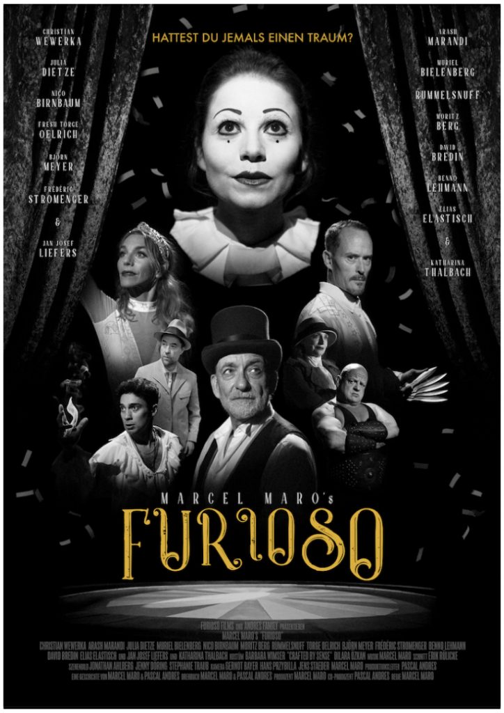 Zu der exquisiten Besetzung zählen unter anderem Christian Wewerka, Jan Josef Liefers, Julia Dietze, Katharina Thalbach, Arash Marandi, Muriel Bielenberg, Fresh Torge, Björn Meyer, und viele weitere große Stars des deutschen und internationalen Kinos. In betörenden Schwarz-Weiß-Bildern fotografiert und mit unvergesslicher Musik umhüllt, ist FURIOSO ein meisterhafter Genuss für die Sinne eines jeden Filmliebhabers. Eine nostalgische und philosophische Reise in die Vergangenheit, zurück zu den goldenen Zeiten der Zirkuskunst.